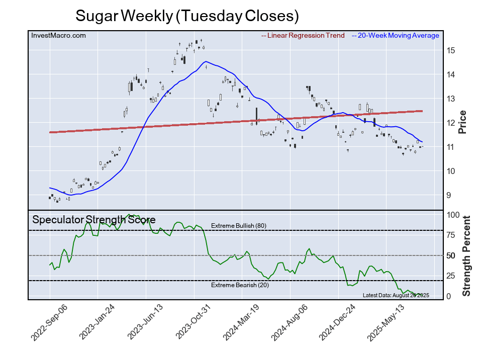 The Sugar speculator position comes in as third most bearish extreme standing of the week. The Sugar speculator level resides at a 1 percent score of its 3-year range.