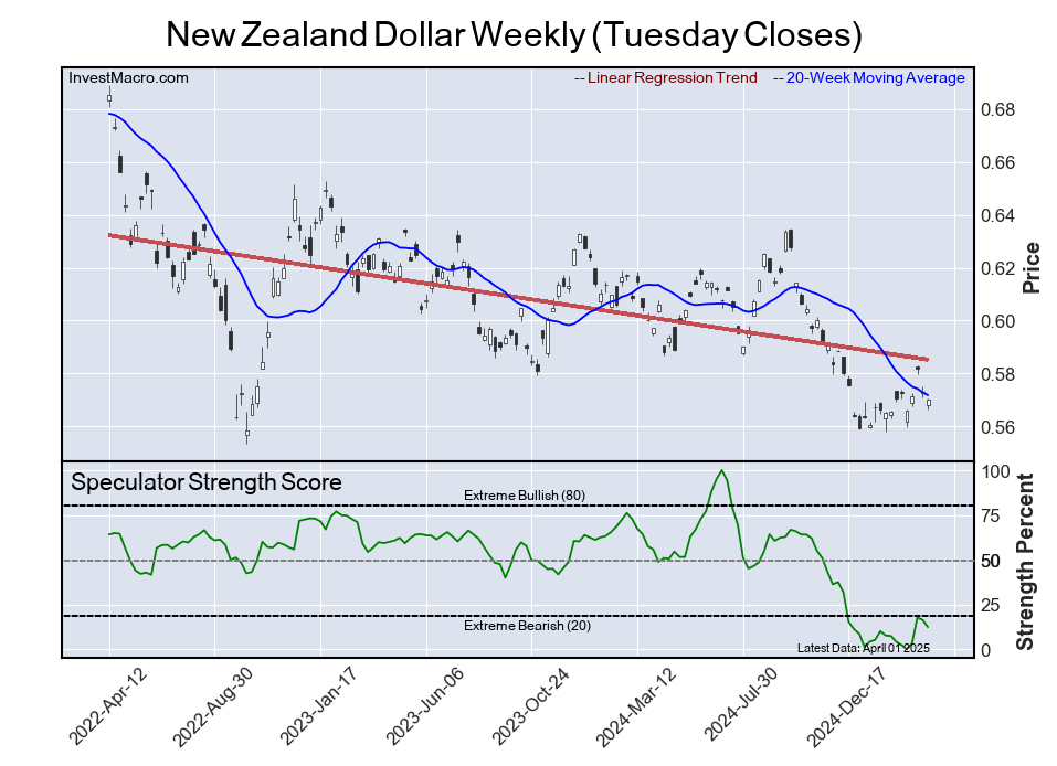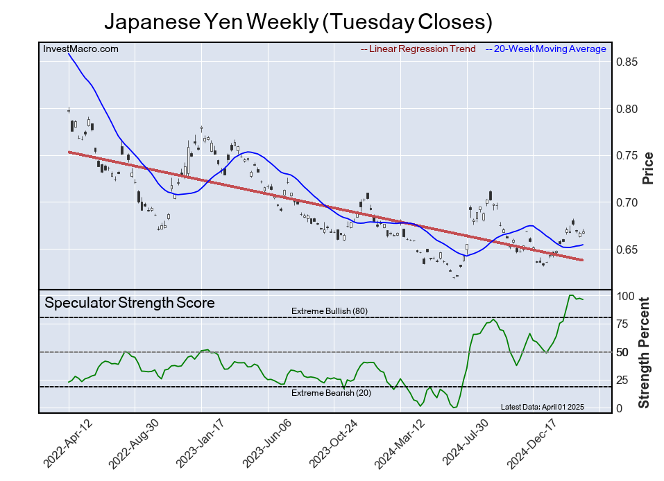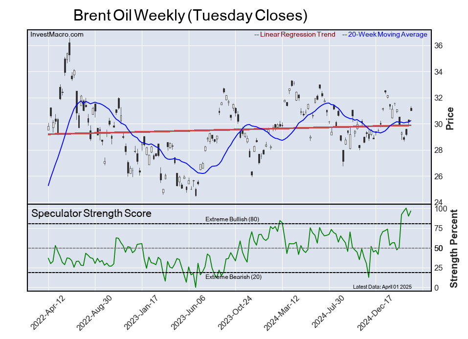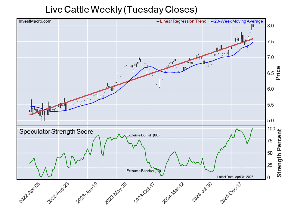 The six-week trend for the speculator strength score was strong -50.2 this week. The speculator position totaled -102,800 net contracts this week with a decrease by -20,252 contracts in the weekly speculator bets.