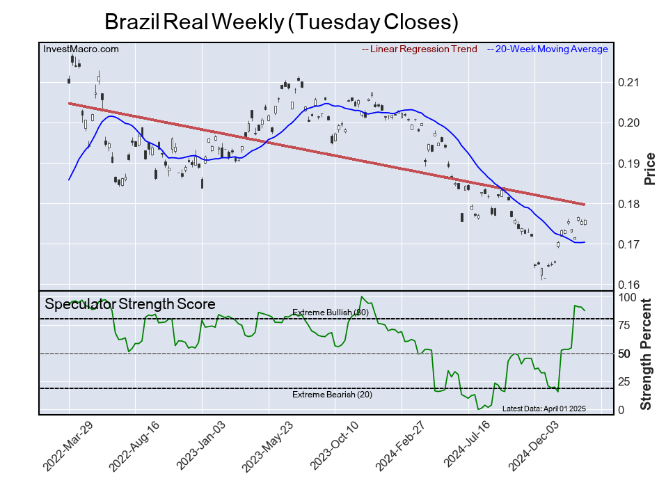 The Brazil Real speculator position rounds out the top five in this week’s bullish extreme standings. The Brazil Real speculator level currently sits at a 87.4 percent score over its 3-year range. The six-week trend for the speculator strength score was a strong 34.3 this week.