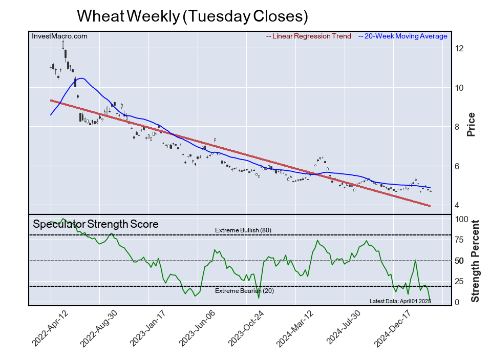 The six-week trend for the speculator strength score was -14.8 this week. The overall speculator position was -2,021,677 net contracts this week with a drop of -121,590 contracts in the speculator bets.
