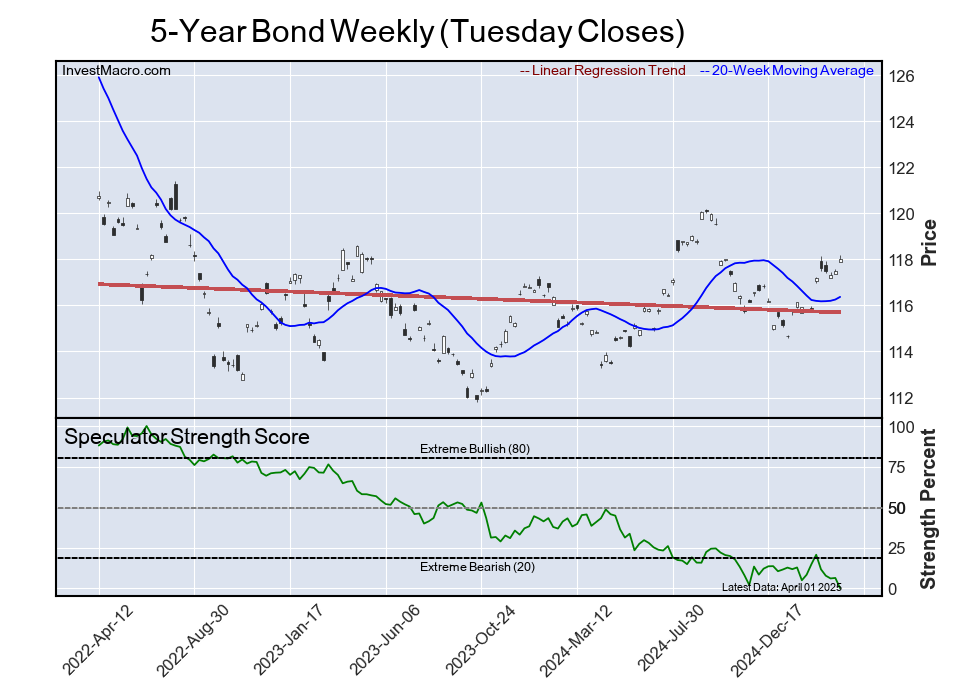 The 5-Year Bond speculator position comes in as the most bearish extreme standing again this week as the 5-Year Bond speculator level dropped to a 0.0 percent score of its 3-year range.