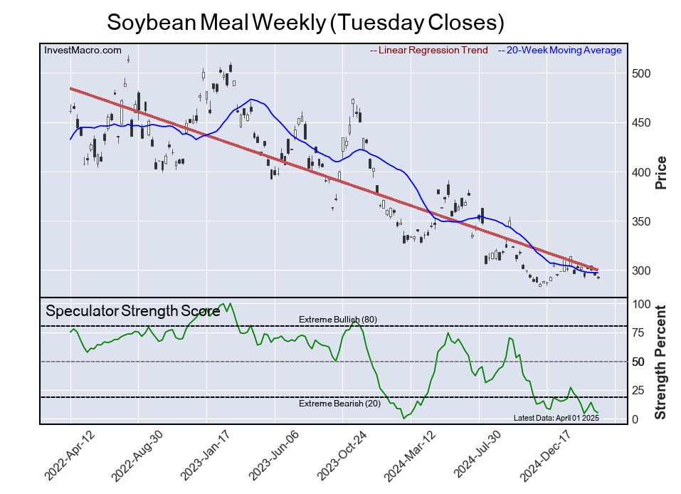 The Soybean Meal speculator position comes in as third most bearish extreme standing of the week. The Soybean Meal speculator level resides at a 5.1 percent score of its 3-year range.