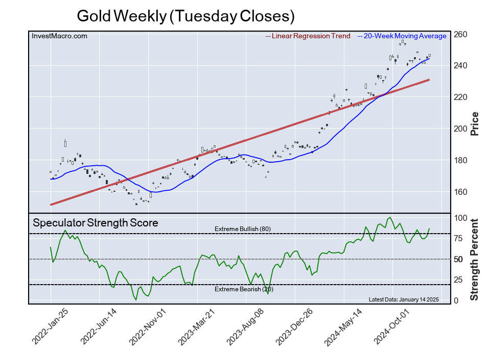 The six-week trend for the percent strength score totaled 25.3 this week. The overall net speculator position was a total of 123,285 net contracts this week with a gain of 4,740 contract in the weekly speculator bets.