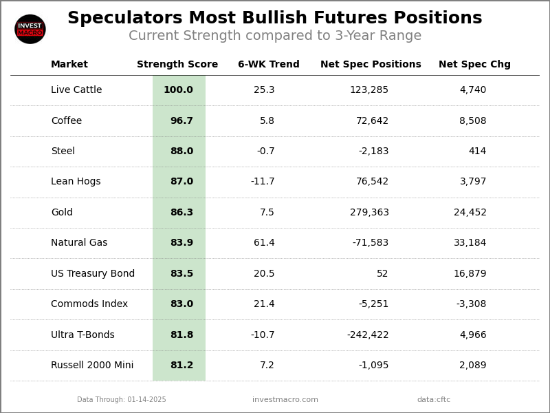 This weekly Extreme Positions report highlights the Most Bullish and Most Bearish Positions for the speculator category. Extreme positioning in these markets can foreshadow strong moves in the underlying market.