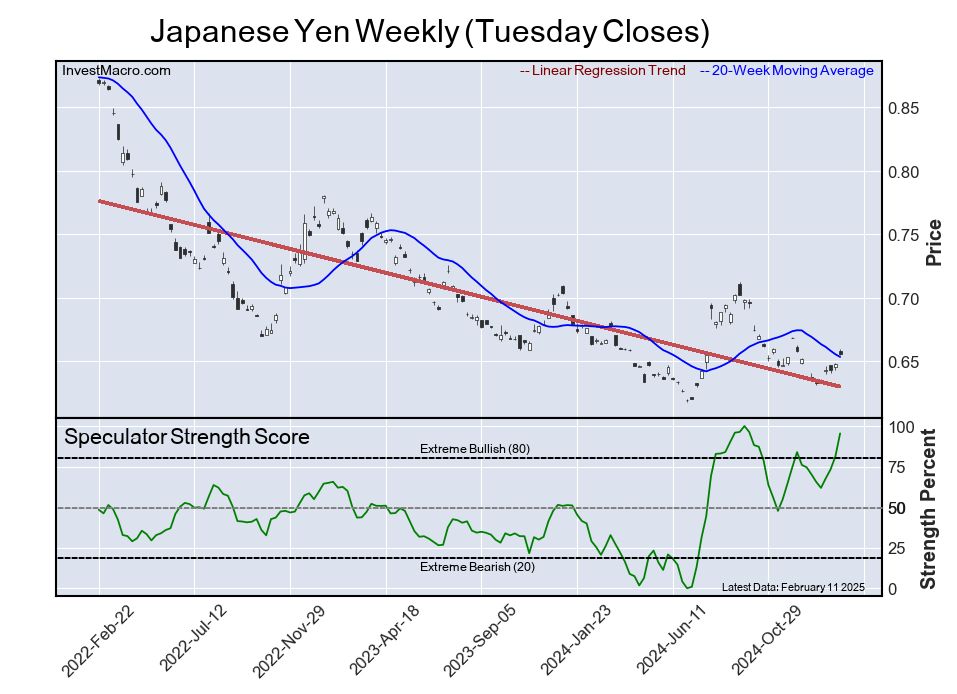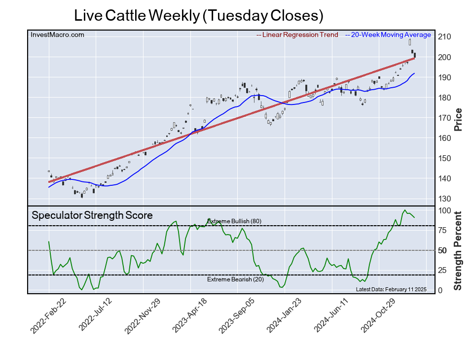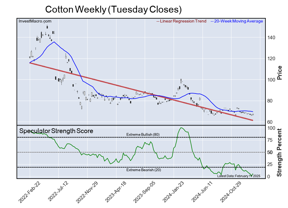 The six-week trend for the speculator strength score was 2.0 this week. The speculator position was -64,425 net contracts this week with a decrease of -5,811 contracts in the weekly speculator bets.