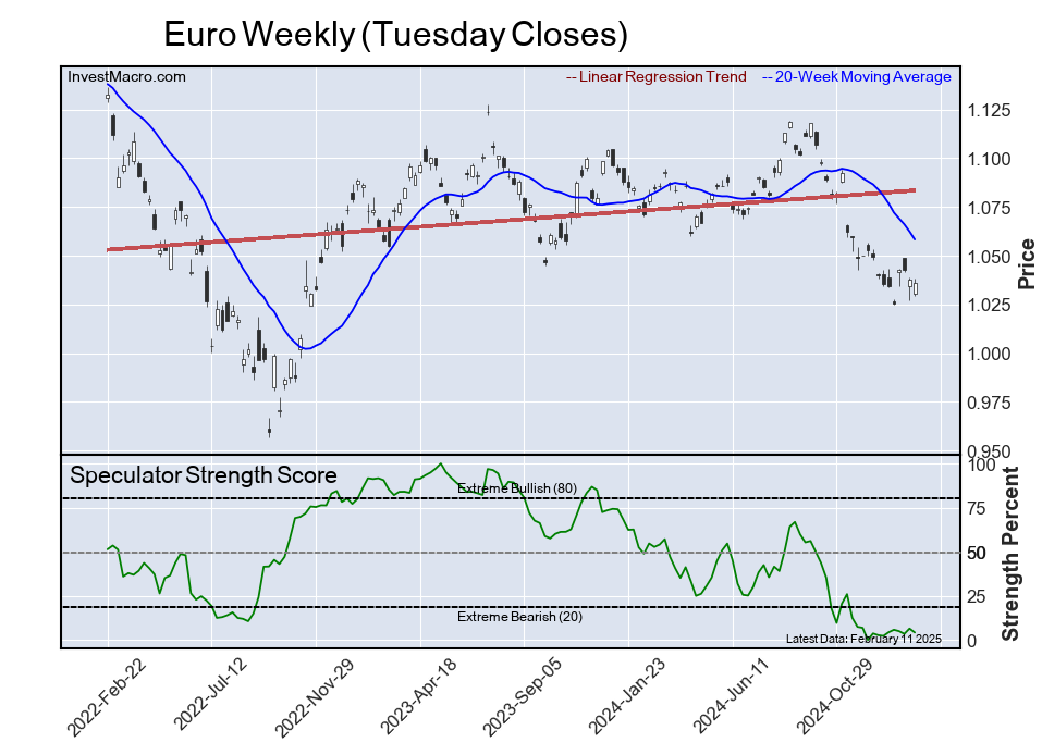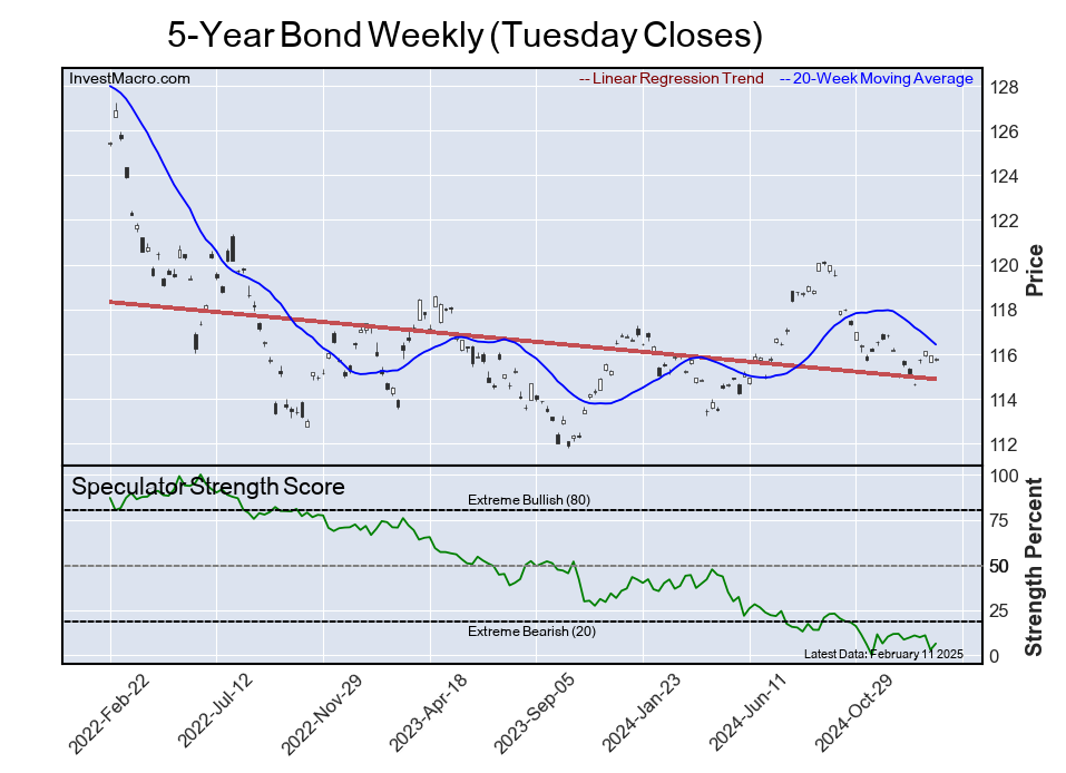 The six-week trend for the speculator strength score was -5.2 this week. The overall speculator position was -42,565 net contracts this week with a rise of 8,202 contracts in the speculator bets.