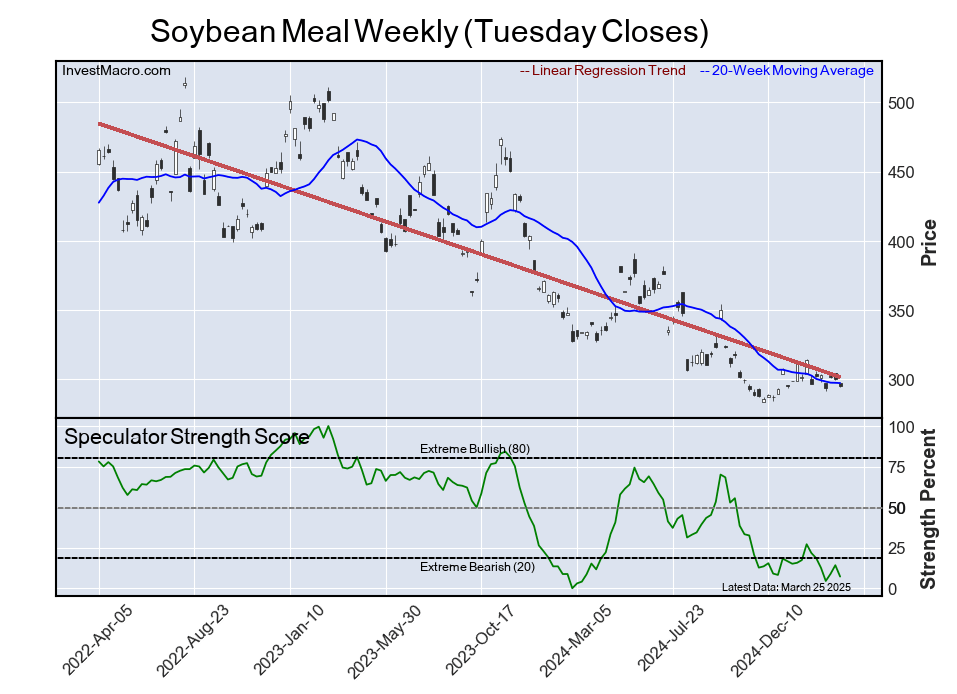 The Soybean Meal speculator position comes in as third most bearish extreme standing of the week. The Soybean Meal speculator level resides at a 7.2 percent score of its 3-year range.