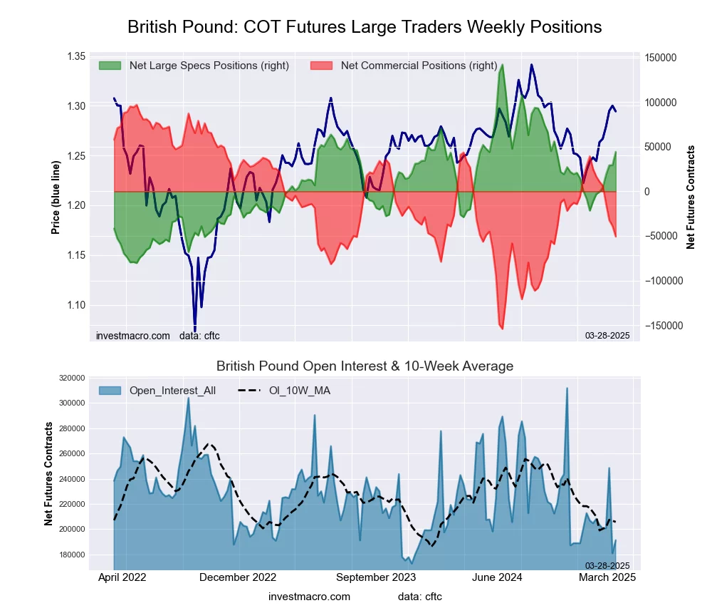 The British Pound Sterling large speculator standing this week equaled a net position of 44,283 contracts in the data reported through Tuesday. This was a weekly rise of 14,881 contracts from the previous week which had a total of 29,402 net contracts.