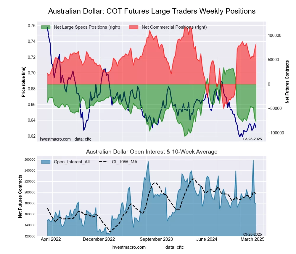 The Australian Dollar large speculator standing this week equaled a net position of -77,446 contracts in the data reported through Tuesday. This was a weekly reduction of -6,997 contracts from the previous week which had a total of -70,449 net contracts.
