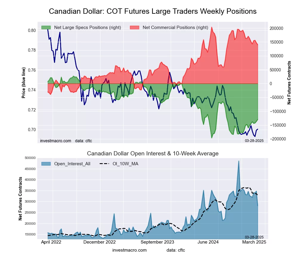 The Canadian Dollar large speculator standing this week equaled a net position of -129,534 contracts in the data reported through Tuesday. This was a weekly gain of 7,048 contracts from the previous week which had a total of -136,582 net contracts.