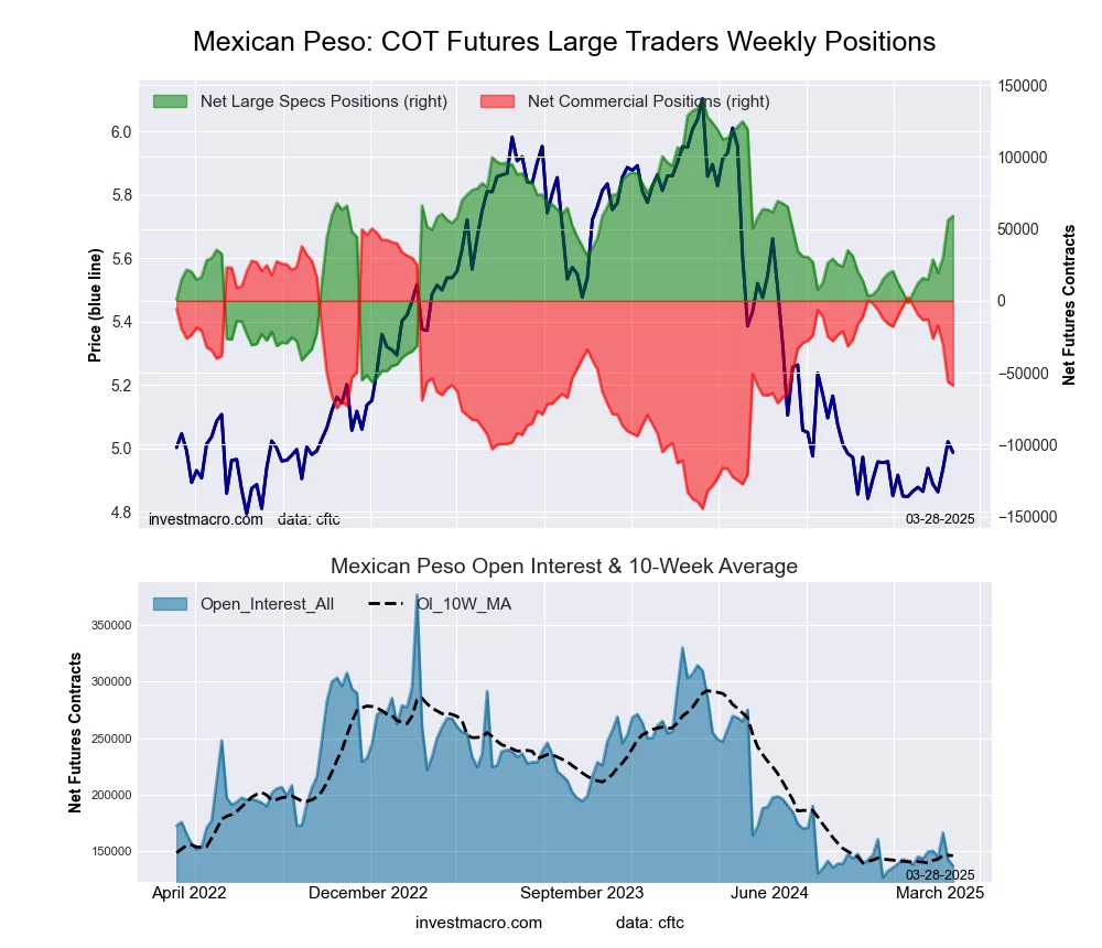 The Mexican Peso large speculator standing this week equaled a net position of 59,039 contracts in the data reported through Tuesday. This was a weekly increase of 3,087 contracts from the previous week which had a total of 55,952 net contracts.