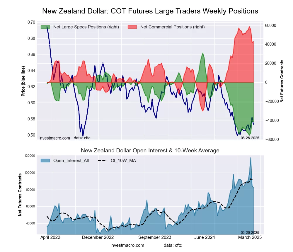 The New Zealand Dollar large speculator standing this week equaled a net position of -41,567 contracts in the data reported through Tuesday. This was a weekly reduction of -1,123 contracts from the previous week which had a total of -40,444 net contracts.