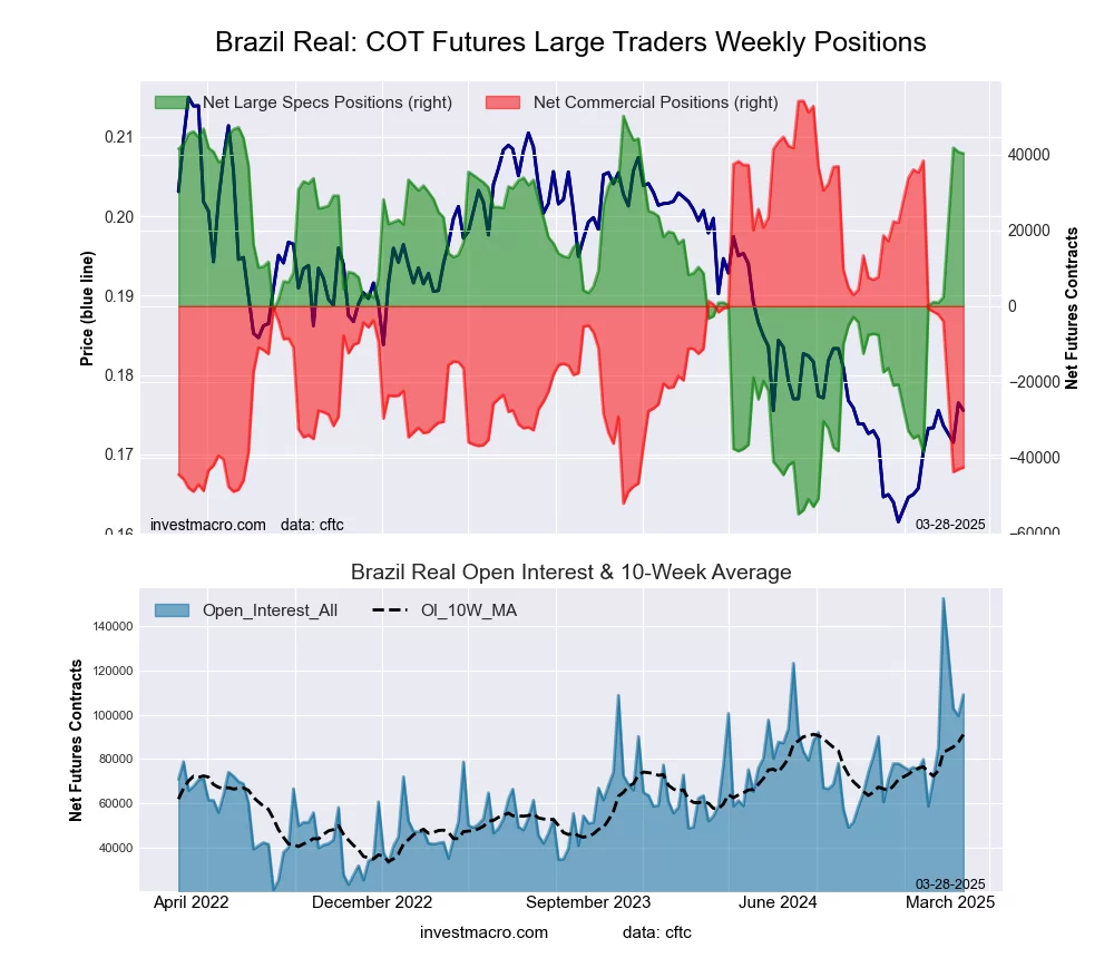 The Brazilian Real large speculator standing this week equaled a net position of 40,349 contracts in the data reported through Tuesday. This was a weekly decrease of -372 contracts from the previous week which had a total of 40,721 net contracts.