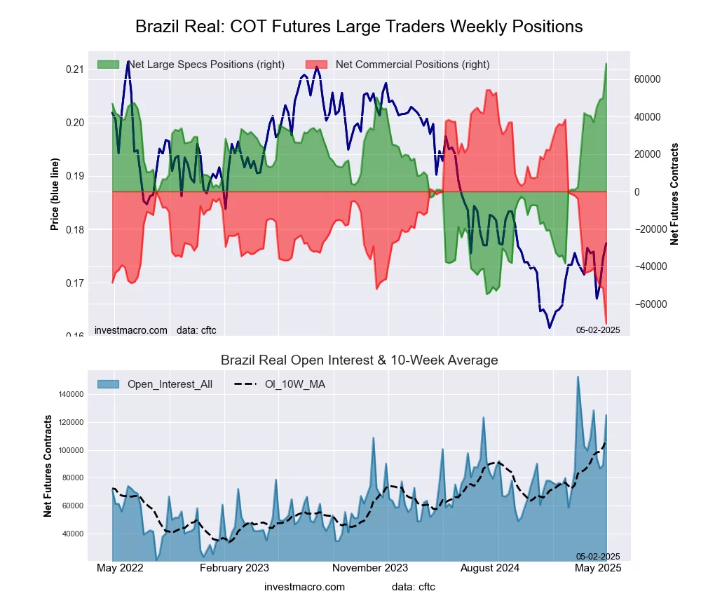 The Brazilian Real large speculator standing this week reached a net position of 68,338 contracts in the data reported through Tuesday. This was a weekly boost of 18,451 contracts from the previous week which had a total of 49,887 net contracts.
