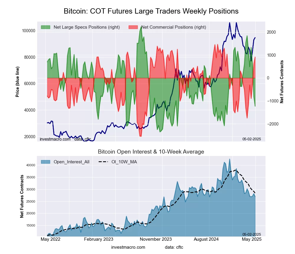 The Bitcoin large speculator standing this week reached a net position of -1,231 contracts in the data reported through Tuesday. This was a weekly fall of -425 contracts from the previous week which had a total of -806 net contracts.