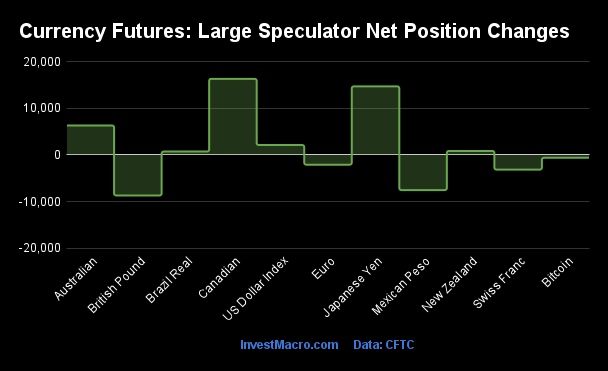 The currencies seeing declines in speculator bets on the week were the British Pound (-8,695 contracts), the Mexican Peso (-7,541 contracts), the Swiss Franc (-3,136 contracts), the EuroFX (-2,089 contracts) and with Bitcoin (-596 contracts) also registering lower bets on the week.