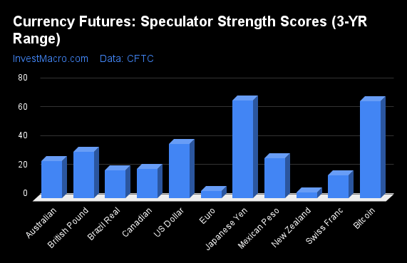 COT Strength Scores (a normalized measure of Speculator positions over a 3-Year range, from 0 to 100 where above 80 is Extreme-Bullish and below 20 is Extreme-Bearish) showed that the Japanese Yen (68 percent) and Bitcoin (67 percent) lead the currency markets this week.