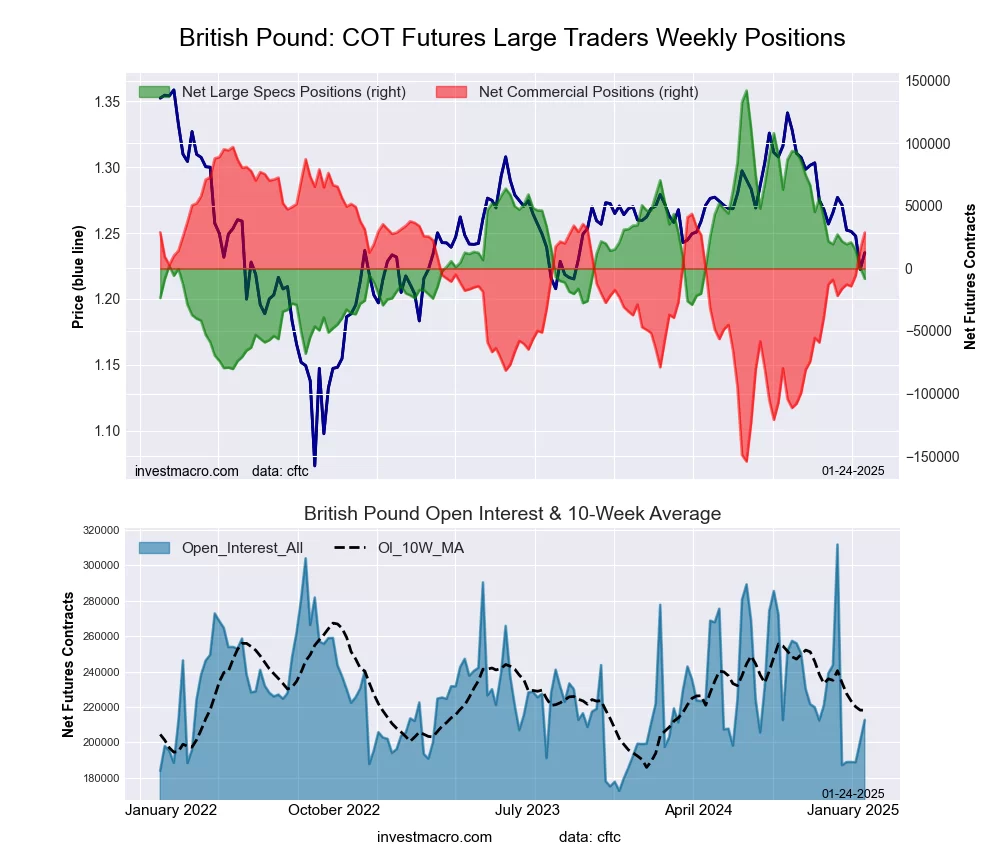 The British Pound Sterling large speculator standing this week reached a net position of -8,257 contracts in the data reported through Tuesday. This was a weekly fall of -8,695 contracts from the previous week which had a total of 438 net contracts.