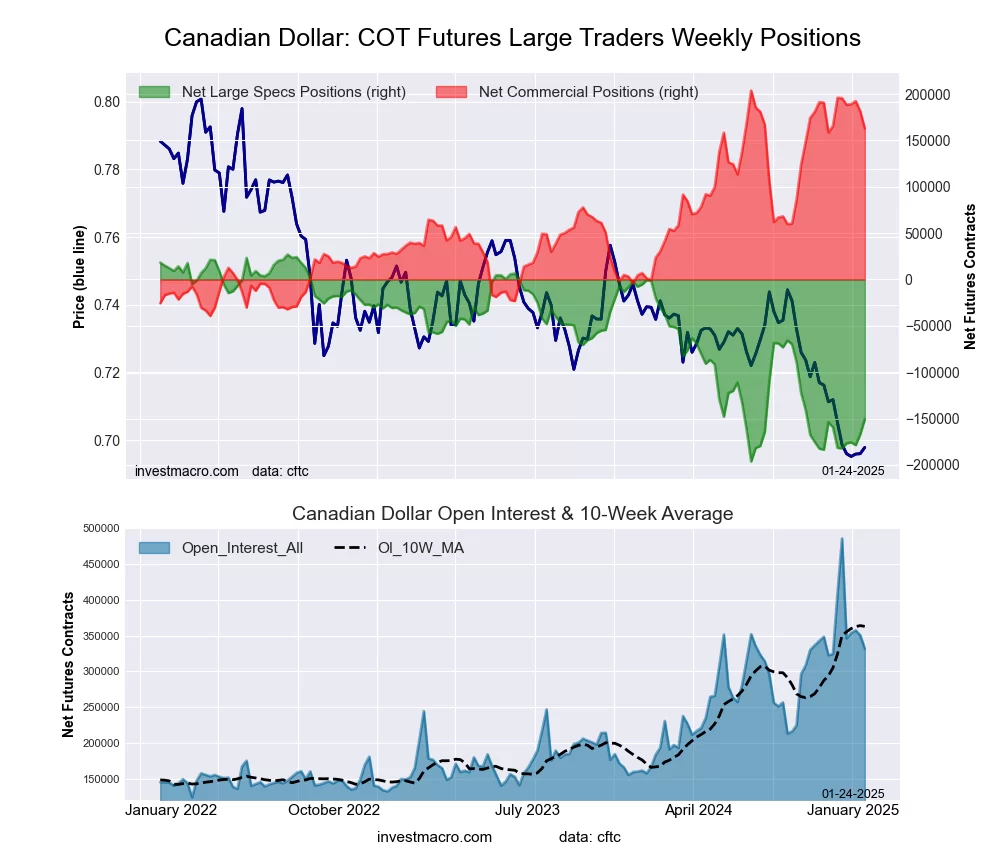 The Canadian Dollar large speculator standing this week reached a net position of -150,787 contracts in the data reported through Tuesday. This was a weekly gain of 16,366 contracts from the previous week which had a total of -167,153 net contracts.