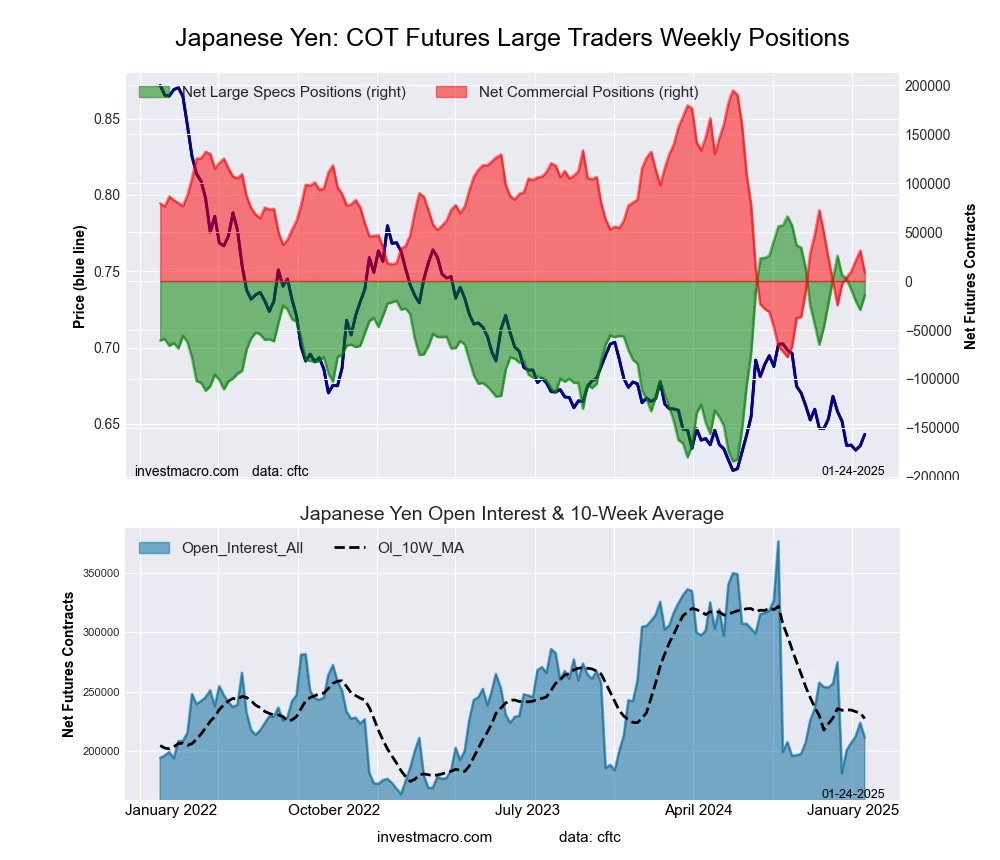 The Japanese Yen large speculator standing this week reached a net position of -14,673 contracts in the data reported through Tuesday. This was a weekly lift of 14,738 contracts from the previous week which had a total of -29,411 net contracts.