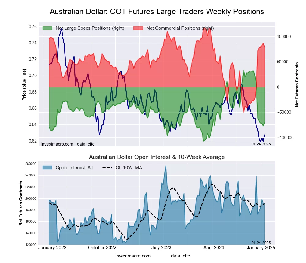 The Australian Dollar large speculator standing this week reached a net position of -71,296 contracts in the data reported through Tuesday. This was a weekly gain of 6,335 contracts from the previous week which had a total of -77,631 net contracts.