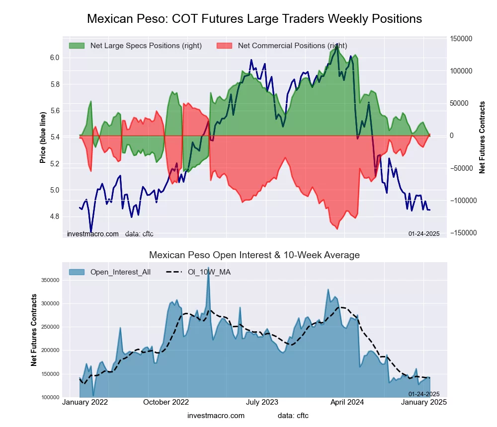 The Mexican Peso large speculator standing this week reached a net position of -1,544 contracts in the data reported through Tuesday. This was a weekly fall of -7,541 contracts from the previous week which had a total of 5,997 net contracts.