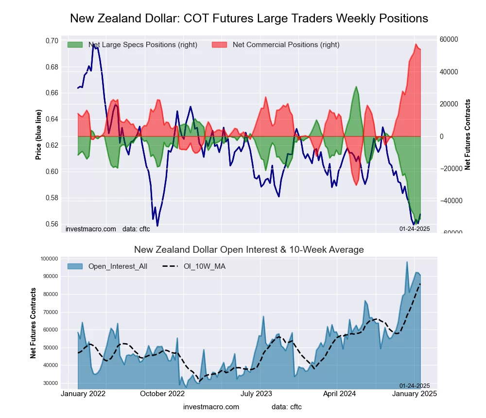 The New Zealand Dollar large speculator standing this week reached a net position of -51,223 contracts in the data reported through Tuesday. This was a weekly lift of 866 contracts from the previous week which had a total of -52,089 net contracts.