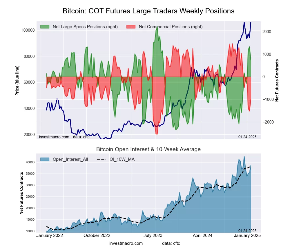 The Bitcoin large speculator standing this week reached a net position of 739 contracts in the data reported through Tuesday. This was a weekly fall of -596 contracts from the previous week which had a total of 1,335 net contracts.