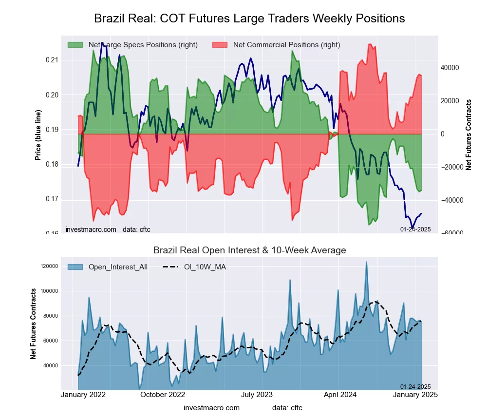 The Brazilian Real large speculator standing this week reached a net position of -34,131 contracts in the data reported through Tuesday. This was a weekly increase of 743 contracts from the previous week which had a total of -34,874 net contracts.