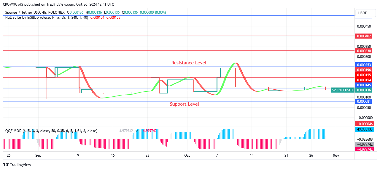 If the resistance level at $0.000136 is broken, Sponge will increase to $0.000196 and $0.000330. If the $0.000136 level holds, and the $0.000087 level permits, the price can fall to the $0.000004 and $0.000006 support levels.