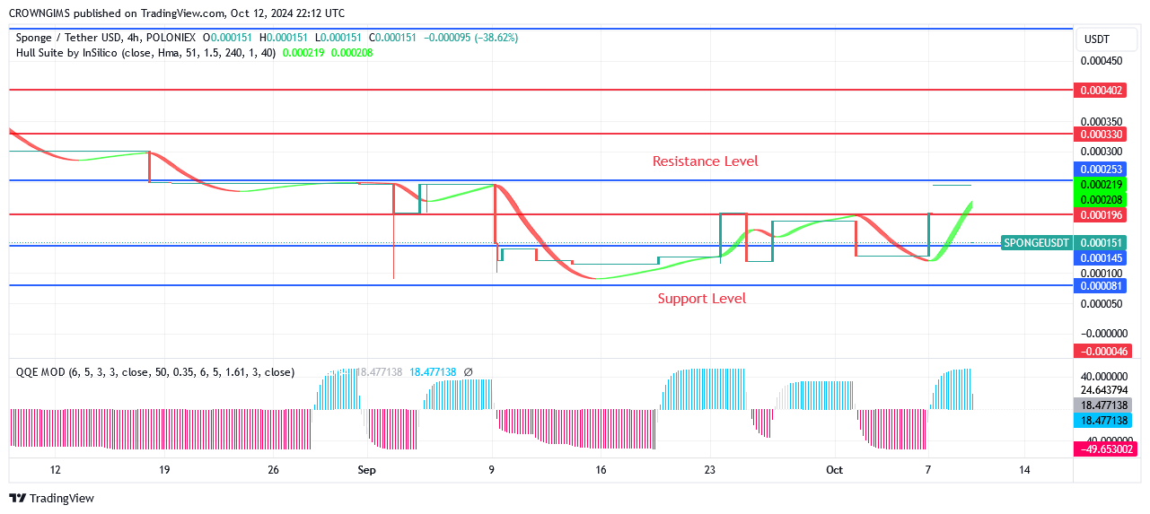 The HULL Suite crypto indicator is crossed by sponge indicates that the bullish trend is strengthening. The QQE MOD indicator and its histogram confirmed bullish trend as it crossing above zero level. The Sponge’s additional upward objectives of $0.000253 and $0.000330 are expected to be reached if the market moves forward if Coin is able to break through the resistance at $0.000199. If the bears are able to hold the resistance level at $0.000199, the price can go below the support levels of $0.000136.