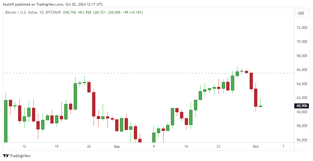 - BTC price also fell, hitting lows of $60,300 before recovering to above $61k.