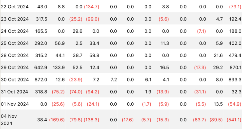 BTC ETFs see $541 million in outflows on Nov. 4. Source: Farside Investors
