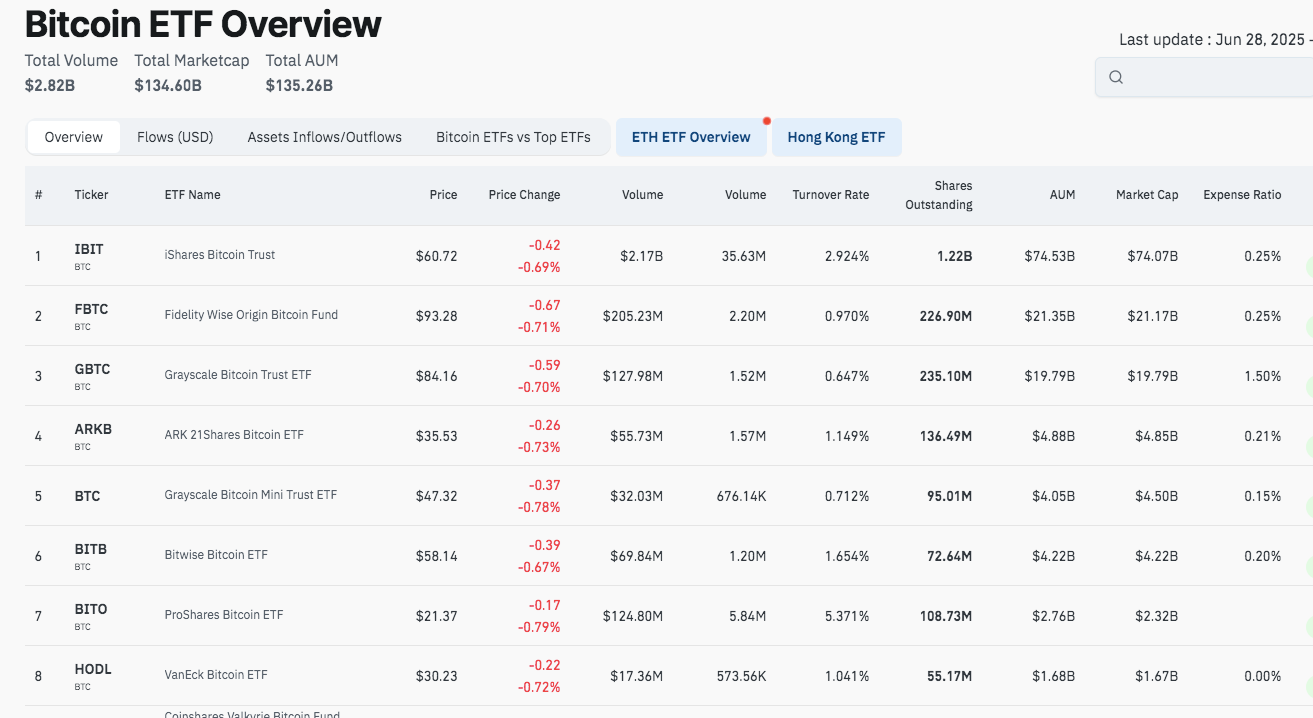 BlackRock’s IBIT led the market, expanding its holdings from 576,000 BTC to 694,000 BTC since early April, leading to an average daily addition of 1,360 BTC. As of June 28, 2025, IBIT reported $74.53 billion in AUM, daily trading volumes of $2.17 billion, and 1.22 billion shares outstanding.