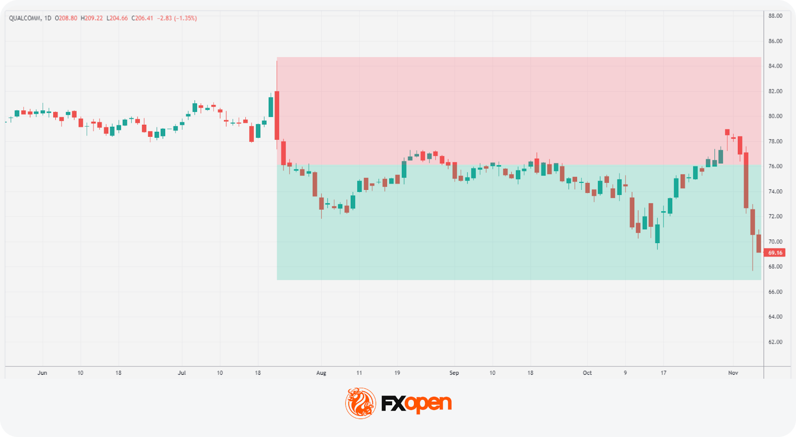 A trader finds a so-called bullish 3 Line Strike setup on the daily chart of Qualcomm stock. However, this time, it serves as a reversal signal, so it becomes bearish. They enter the short position at the close of the candle, following the pattern. Their stop loss is above the setup, with the take profit at the next support level.