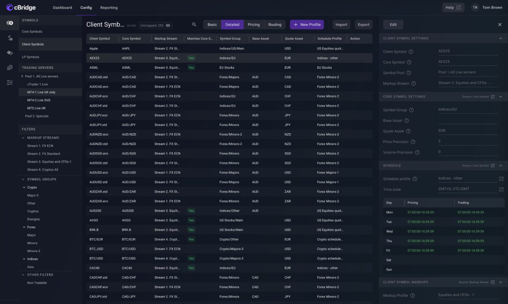 cBridge is structured around the day-to-day workflows of dealing and operations teams. Within one workspace, the interface combines guided layouts, right-side context panels and cross-setting references. Context panels surface linked settings and dependencies at the point of configuration, while cross-setting references help teams follow relationships between symbols, streams, trading servers and routing rules. Guided layouts speed up setup and reduce the time needed to diagnose issues when changes are made. Together, these interface elements keep setup changes, dependency checks and troubleshooting within the same operational flow.