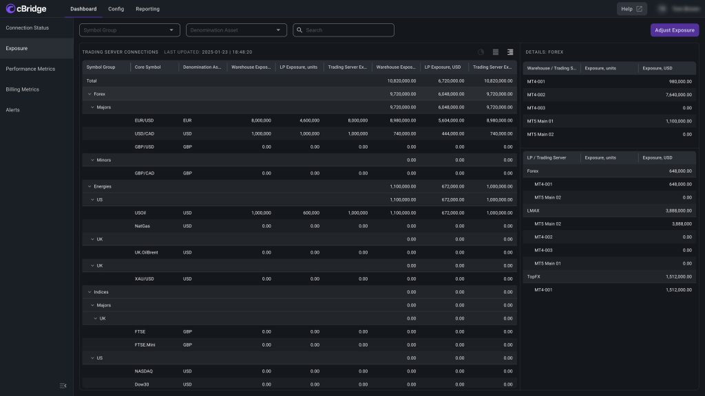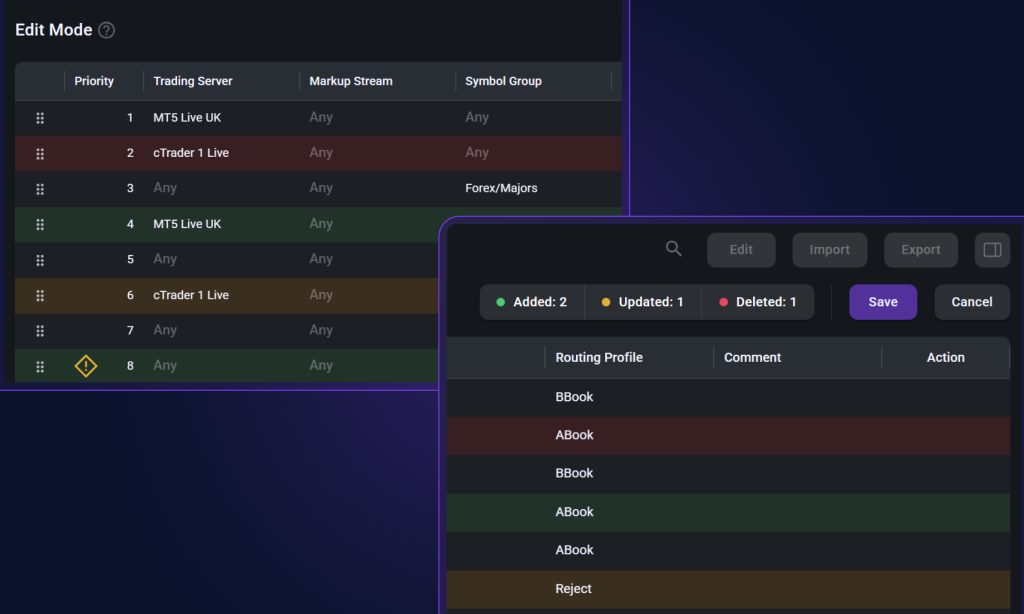 cBridge validates settings across symbols, streams and routing rules, including the bridge-to-platform boundary, where certain conflicts are not always visible during initial setup. Once a symbol’s price feed has been injected into a trading server, for instance, it cannot be streamed again with a different markup for another client group. Duplicate pricing streams can also place unnecessary update load on the server. Cross-setting consistency checks and platform-aware validation help catch these conditions prior to deployment.