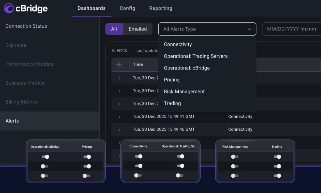 cBridge delivers role-based alerts by email and through a dedicated alert dashboard, covering both technical and operational anomalies. Email notifications include clear details on the underlying anomaly, and the dashboard extends this with filters for current alerts and full history. Alerts are grouped by function – connectivity issues, trading server events, pricing inconsistencies, execution-related signals and cBridge operational issues, ensuring each team receives what is relevant to their area.