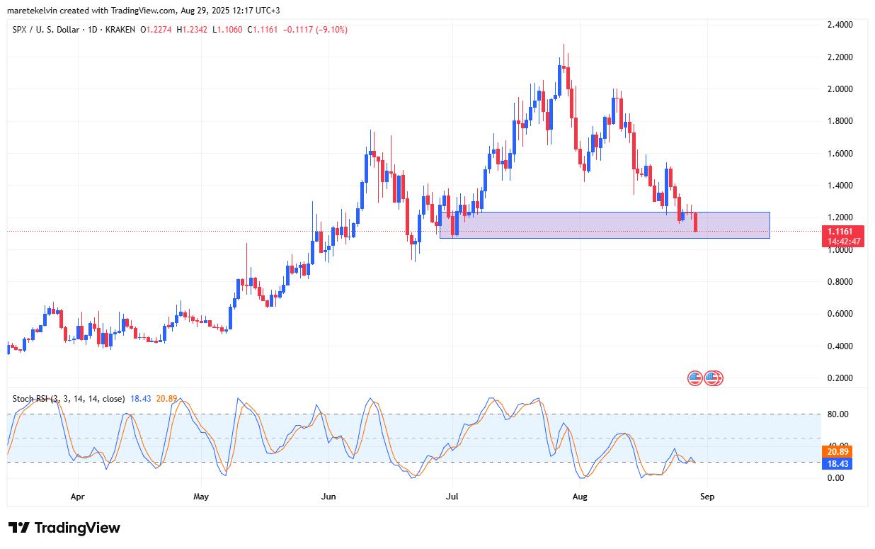 SPX dipped 12% in 24 hours, with the $1.15 demand zone now acting as the key support. Whale accumulation is rising, but seller dominance in spot and futures markets keeps downside risks alive.