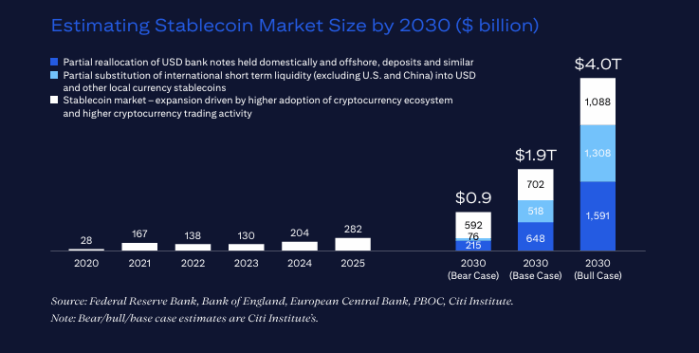 That projection originates from Citi, whose analysts now estimate a base case of $1.9 trillion in stablecoin issuance by 2030, up from earlier forecasts. In a bullish scenario, the bank predicts issuance reaching $4 trillion.