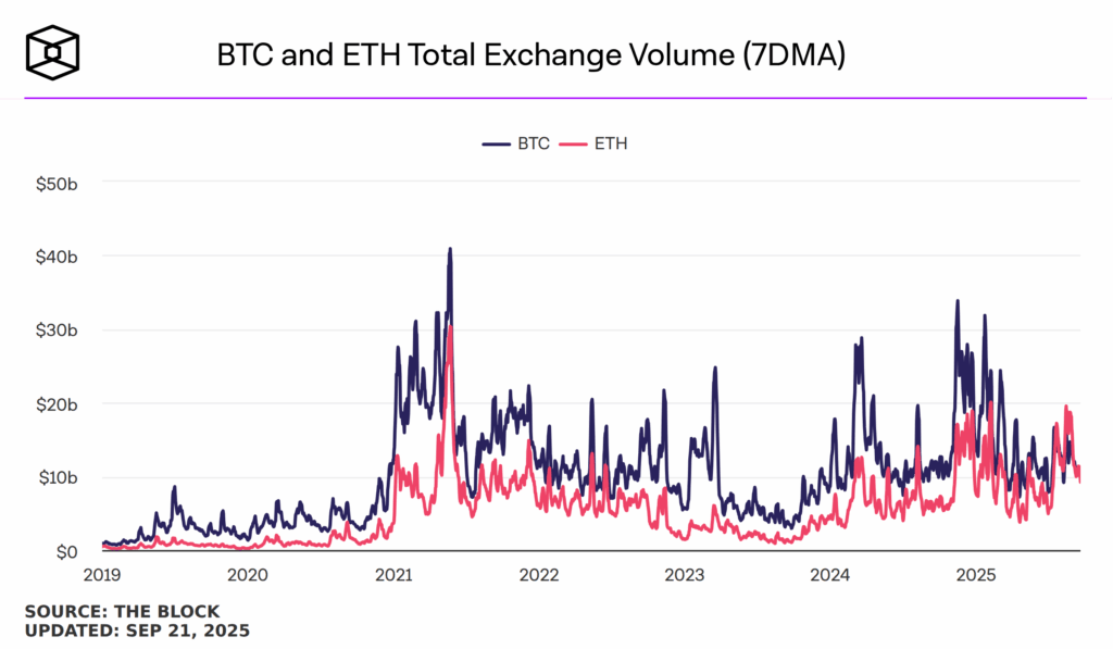 For the first time in history, Ethereum’s total exchange volume overtook Bitcoin’s. This milestone came on 22 July, when ETH recorded $16.94 billion in volume compared to Bitcoin’s $16.64 billion. Ethereum kept its lead throughout August, the same month it reached a new all-time high. However, by September, BTC regained the top spot, but the gap between the two remained small.