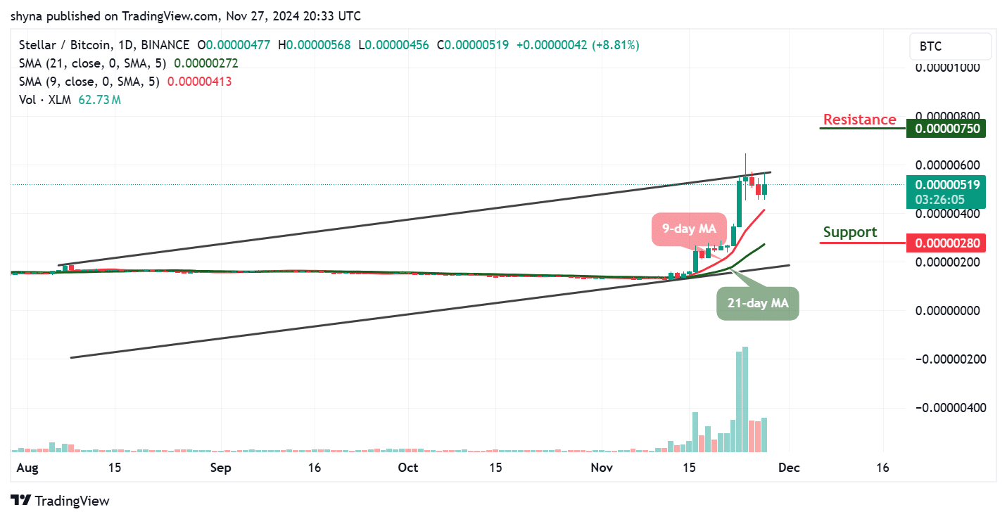 Against Bitcoin, the Stellar price is heading to the north as the coin moves above the 9-day and 21-day moving averages. Nevertheless, following the recent positive sign, the current market movement may begin to follow an uptrend if the buyers push the price above the upper boundary of the channel.