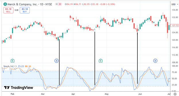 Here is Merck (MRK) with the stochastic indicator having a blue background when the stochastic is above 20 and below 80.