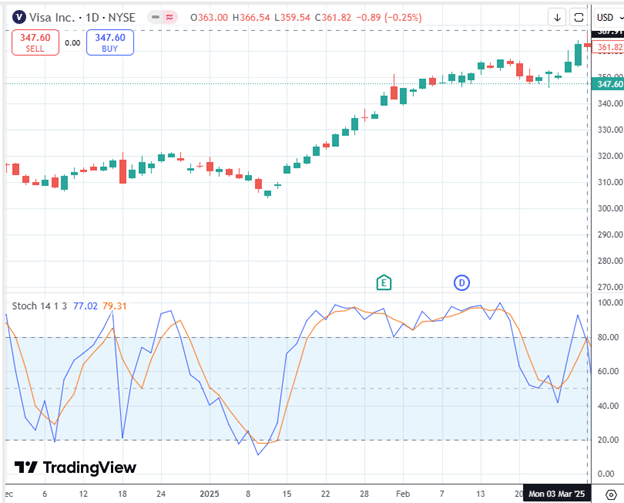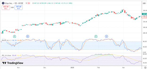 On Friday, January 17, 2025, Visa stochastics show overbought.