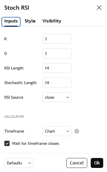 - The default Stochastic RSI settings are 14, 3, and 3.