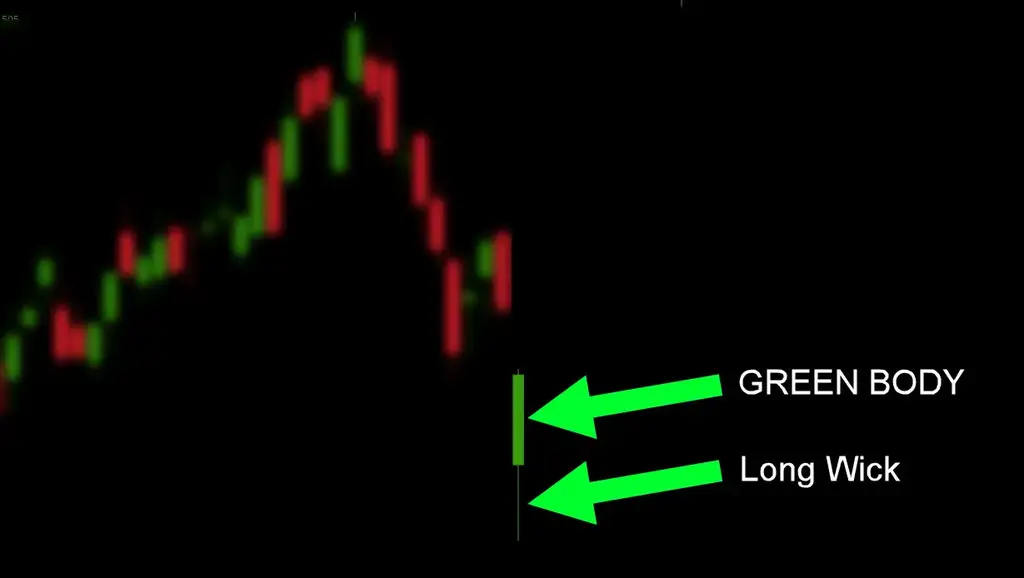 In a nutshell, you need to see a wick at the bottom, followed by a big GREEN giant body.