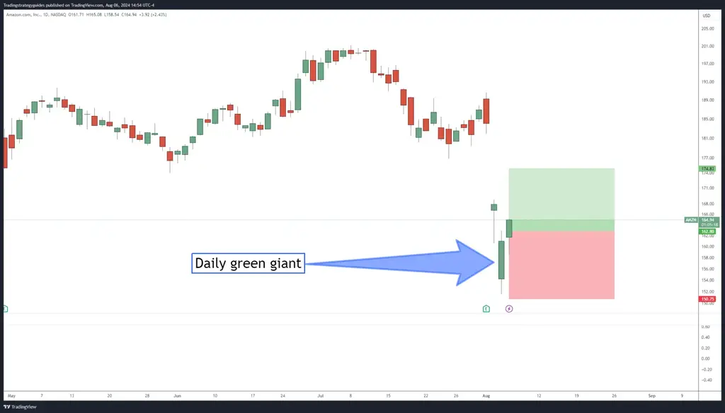 The entry for this strategy is simple. Once price breaks above the daily green giant candlestick pattern, you get into a buy position.