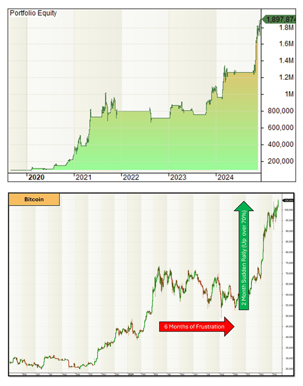 Our newest crypto system called Crypto Seasons is doing a fantastic job capitalising on this move. Crypto Seasons is up over 80% in 2024! Here is the backtested equity curve of the system which neatly jumps between Bitcoin, Altcoins and Fiat depending on which is performing best at the time.