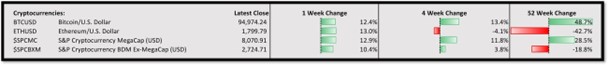 There is a lot of strength emerging in Crypto at the moment with both Bitcoin and Altcoins rallying this week. Both major crypto indices in the table below are up over 10% which is a really welcome change.