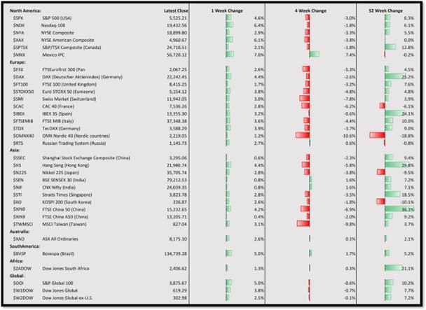 The table of global indices below is showing all markets edging forward in the last week. I would say this is all highly correlated to the easing of the uncertainty coming out of the White House, but it could certainly change on a dime with the next announcement.